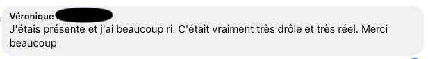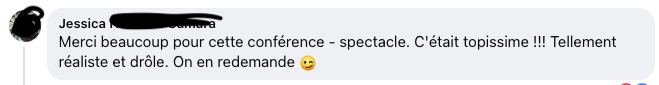 « C’était vraiment vivant. Très bien illustré avec des exemples concrets. Beaucoup d’humour et on se rend compte qu’on n’est pas tout seul dans la même situation et que tout peut s’améliorer. »