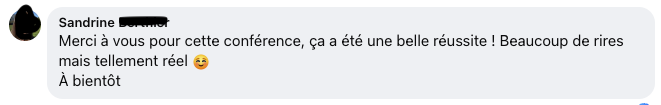 « Merci pour cette conférence top et dynamique comme j’aime. Fluidité – clarté – apprentissage«